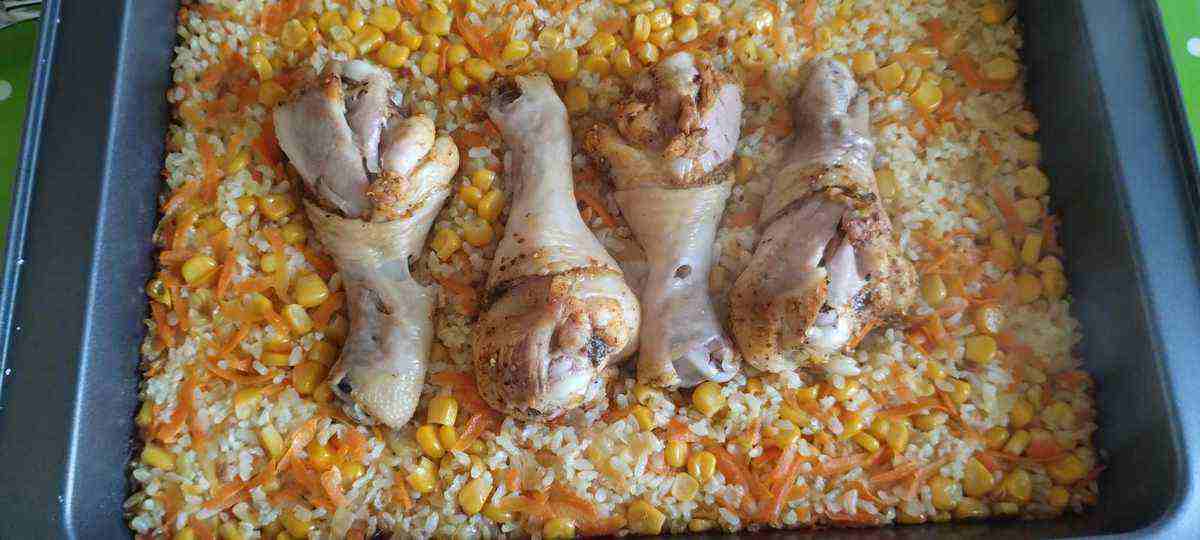 Спершу натріть курячі гомілки з усіх сторін сіллю і перцем, паприка (або спеціальною приправою) і залишіть їх, щоб трохи просякли приправою. Потім треба злити рідину з кукурудзи. Цибулю почистити і дрібно нарізати. Моркву також почистити і натерти на тертці, а рис промити.